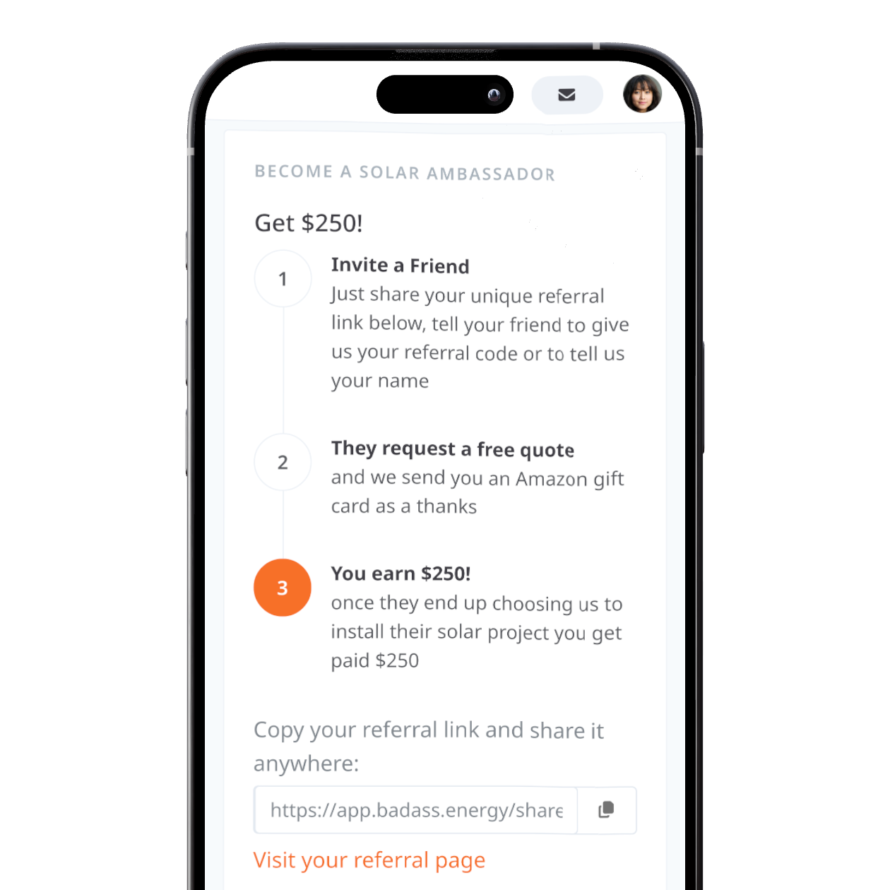 Have you been happy with Badass Energy Inc? Refer a friend or family member conveniently by sending their contact info through the app or sharing your personalised referral page with them and earn money as a thank you.